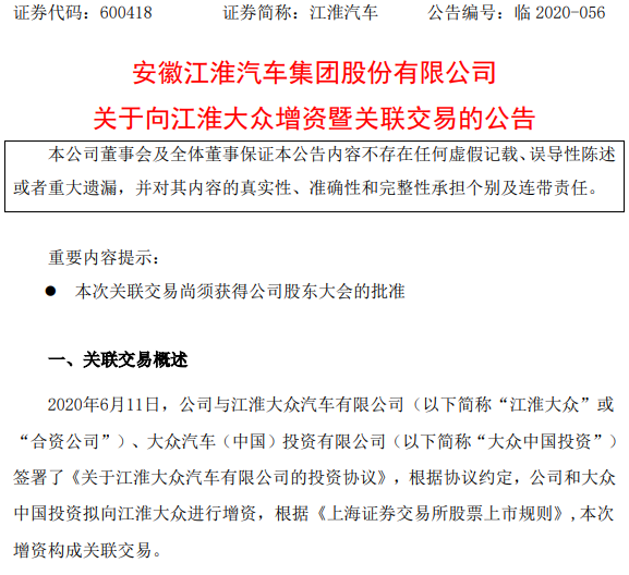 江淮汽車方面表示,“本次增資系公司和大眾中國投資戰(zhàn)略合作中的重要環(huán)節(jié),本次增資有利于推進公司和大眾中國投資的戰(zhàn)略合作,有利于促進合資公司的發(fā)展?!?/span>