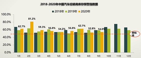即便處于汽車市場的“金九”旺季,經(jīng)銷商的庫存壓力依然不小。昨日(10月13日),流通協(xié)會(huì)發(fā)布數(shù)據(jù)顯示,9月,國內(nèi)汽車經(jīng)銷商庫存預(yù)警指數(shù)為54.0%,較上月上升1.2個(gè)百分點(diǎn),較去年同期下降4.6個(gè)百分點(diǎn),庫存預(yù)警指數(shù)位于榮枯線之上。