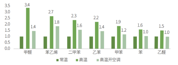 高溫模式下的揮發(fā)性有機(jī)物測評結(jié)果不如人意,濃度平均為常溫下的2倍。甲醛、乙醛、二甲苯和苯乙烯分別為常溫模式的3.8倍、1.5倍、2.3倍和2.7倍。由此可見,消費(fèi)者“溫度越高,車?yán)镂兜涝酱蟆钡臉闼馗兄c測試結(jié)果相符,高溫下的車內(nèi)污染問題亟待解決。?