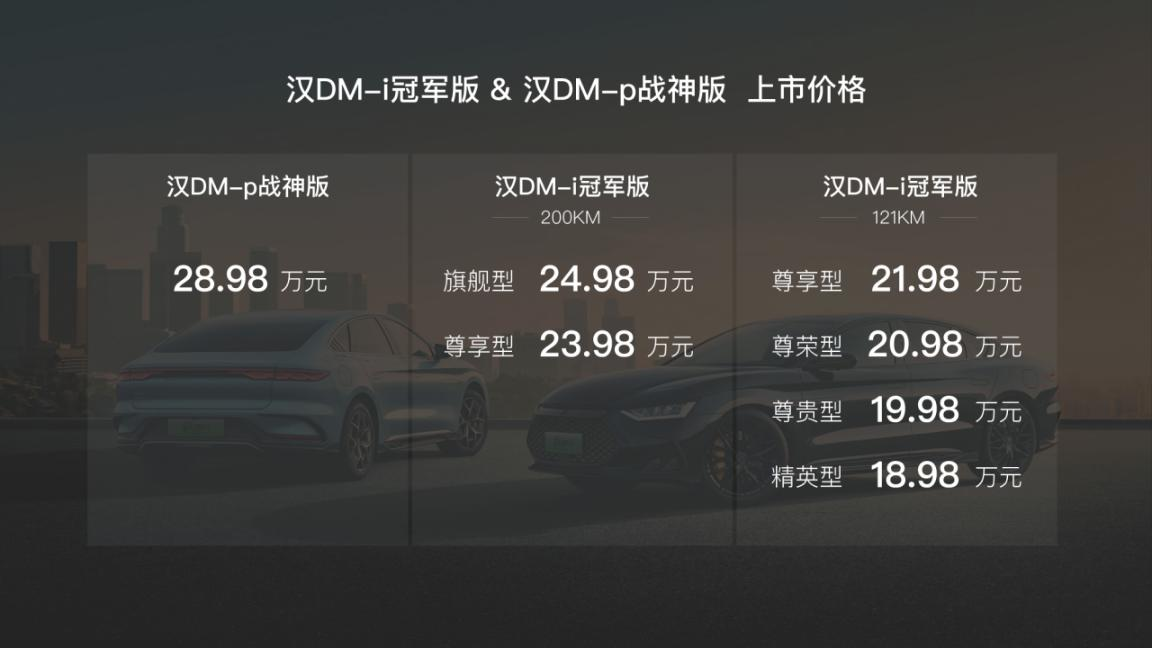 央廣網(wǎng)北京5月18日消息 今日比亞迪全新漢DM系列正式上市。其中,漢DM-i冠軍版攜色彩、底盤(pán)、體驗(yàn)三大煥新而來(lái),更重磅推出200km純電續(xù)航版本,將徹底顛覆主流B轎市場(chǎng)!同時(shí),比亞迪首款量產(chǎn)改裝超混轎跑漢DM-p戰(zhàn)神版驚艷來(lái)襲,憑借理念、氣質(zhì)、實(shí)力三項(xiàng)全能,多維滿(mǎn)足用戶(hù)個(gè)性化需求!