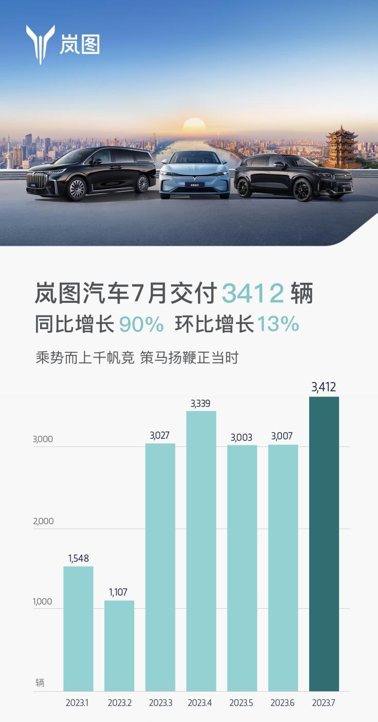 央廣網(wǎng)北京8月1日消息 今日,嵐圖汽車公布2023年7月交付數(shù)據(jù)。2023年7月,嵐圖交付新車3412輛,同比上漲90%,環(huán)比上漲13%。在競(jìng)爭(zhēng)愈加激烈的市場(chǎng)競(jìng)爭(zhēng)下,嵐圖汽車憑借其卓越的產(chǎn)品硬實(shí)力,銷量連續(xù)五個(gè)月超3000輛,潛力持續(xù)釋放。