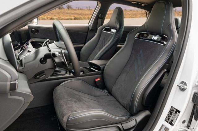 內(nèi)飾部分,伊蘭特N依舊保留了現(xiàn)代家族的雙聯(lián)屏布局,中控臺采用大面積皮革包袱。為進一步突出運動屬性,新車的方向盤、門飾板以及座椅等處,還加入了翻毛皮材質(zhì)。