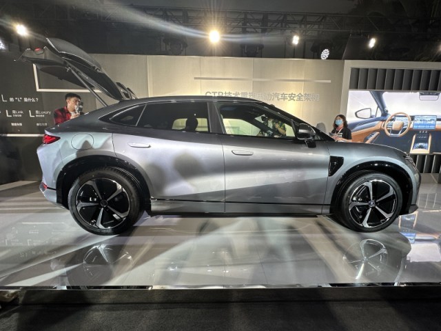 車身側(cè)面,新車采用溜背式設(shè)計(jì),整體造型流暢且動感;無框式車門、隱藏式車門把手搭配大尺寸五輻式輪圈以及黑色輪眉裝飾,運(yùn)動感極強(qiáng)。