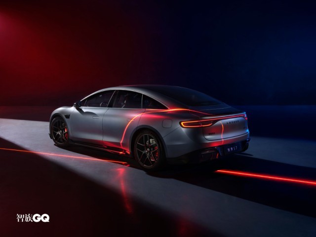新車側(cè)面造型較為飽滿、流暢,略微向下傾斜的車頂線條搭配隱藏式車門把手和車窗邊框處的鍍鉻飾條進(jìn)行點(diǎn)綴時(shí)尚感較強(qiáng)。此外,智界S7還配備五輻式熏黑輪圈和紅色涂裝的高性能剎車卡鉗。車尾部分,修長的貫穿式LED尾燈組點(diǎn)亮后辨識(shí)度較強(qiáng),鴨尾式擾流板與寬大的亮黑色后包圍組件則增強(qiáng)了車尾的視覺層次感。