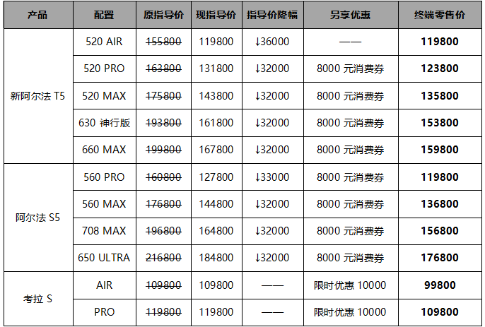 即日起,極狐對新阿爾法T5和阿爾法S5官方指導(dǎo)價進(jìn)行下調(diào),官方降價32000元,還可另享8000元消費券,如此一來,5系“雙子星”終端零售價最低僅需11.98萬元;考拉S限時優(yōu)惠增至10000元,終端零售價直接下探到了9.98萬元起。