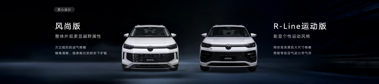 外觀造型上,為滿足當(dāng)下用戶多元化的審美需求,全新探岳L提供兩種前臉設(shè)計。其中,風(fēng)尚版車型的前臉方正且規(guī)則的進氣格柵,輔以棱角清晰、線條粗壯的拱形下護板,整體外觀更顯越野屬性。相比之下,R-Line運動版則采用了品牌標(biāo)志性的網(wǎng)狀、高亮黑、大尺寸格柵,與兩側(cè)夸張的空氣動力學(xué)氣簾相得益彰,賦予車輛更凌厲氣質(zhì),充分彰顯個性運動風(fēng)格。