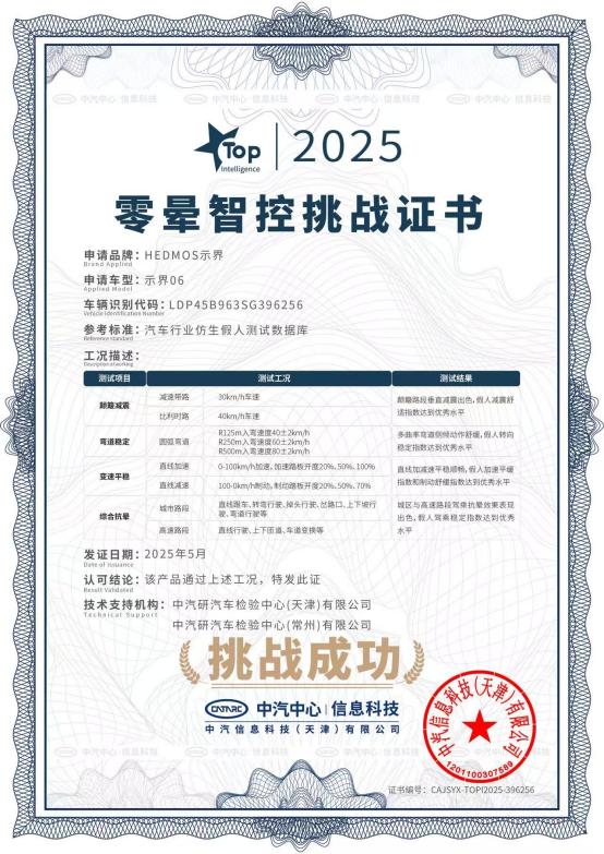 近期,在行業(yè)首次的暈動(dòng)仿生假人零暈智控挑戰(zhàn)中,示界06展現(xiàn)了優(yōu)異的駕控表現(xiàn)。中國(guó)汽車研究中心有限公司高級(jí)工程師趙博文在發(fā)布會(huì)現(xiàn)場(chǎng)公布測(cè)試數(shù)據(jù)時(shí)指出:“通過精準(zhǔn)的電機(jī)扭矩動(dòng)態(tài)分配、法系底盤調(diào)?;颍约按钶d的‘零暈智控’技術(shù)體系,示界06在六維駕控測(cè)試中表現(xiàn)出行業(yè)優(yōu)秀水平。”測(cè)試結(jié)果顯示,示界06完美實(shí)現(xiàn)了“6不”卓越體驗(yàn):簸路不顛、彎道不飄、加速不竄、減速不抖、駕乘不暈、長(zhǎng)途不累,為行業(yè)樹立了駕乘舒適新標(biāo)桿。