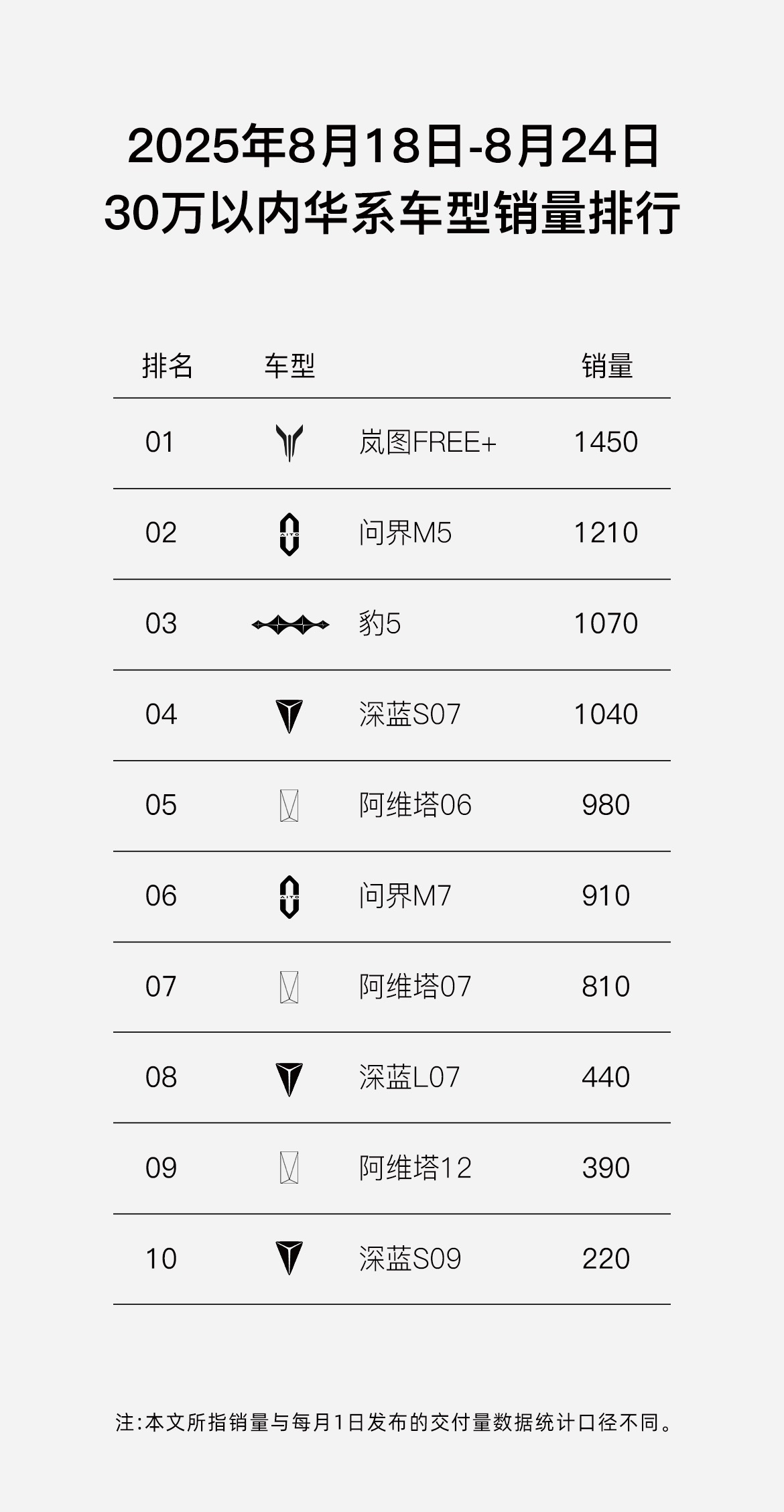 央廣網(wǎng)北京8月27日消息(記者姜鵬)8月第三周(8月18日-8月24日),嵐圖FREE+再創(chuàng)銷量佳績:單周銷量達到1450輛,再次奪得第34周“30萬內(nèi)華系車型銷冠”,并強勢躋身20-30萬級混動SUV銷量 Top2。截至8月24日,嵐圖FREE+當月累計銷量已達4110輛,穩(wěn)坐30萬以內(nèi)華系車型銷量Top1。