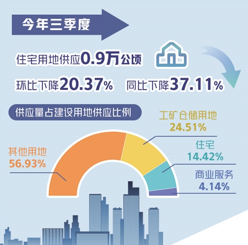 中國國土勘測規(guī)劃院新近發(fā)布的全國主要城市地價監(jiān)測報告顯示,三季度住宅用地供應0.9萬公頃,環(huán)比下降20.37%,同比下降37.11%,住宅用地供應同比增速為2015年以來單季最低。