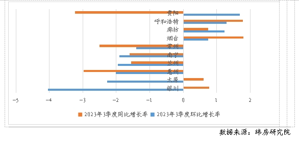 緯房研究院數(shù)據(jù)顯示,重點(diǎn)40城中,僅有10個(gè)城市住房租金環(huán)比上升,其余30個(gè)城市住房租金均環(huán)比下降。其中,租金上漲的城市增幅也并不可觀,環(huán)比增長(zhǎng)率大多不到1%。租金下跌的30城中,12個(gè)城市租金跌幅在1%以內(nèi),12個(gè)城市跌幅在1%-2%之間,6個(gè)城市跌幅超過2%。與2022年三季度末相比,重點(diǎn)40城中16個(gè)城市住房租金同比上漲,24個(gè)城市同比下降。其中,3個(gè)城市同比增長(zhǎng)超過2%,13個(gè)城市同比漲幅在2%以內(nèi),12個(gè)城市同比跌幅在2%以內(nèi),11個(gè)城市同比跌幅在2%-4%之間,1個(gè)城市同比跌幅超過4%。