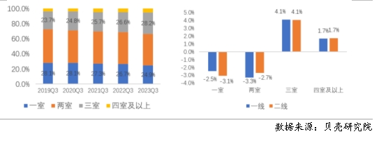 大戶型占比增加趨勢(shì)顯著,三居室成交占比首次超過一居室