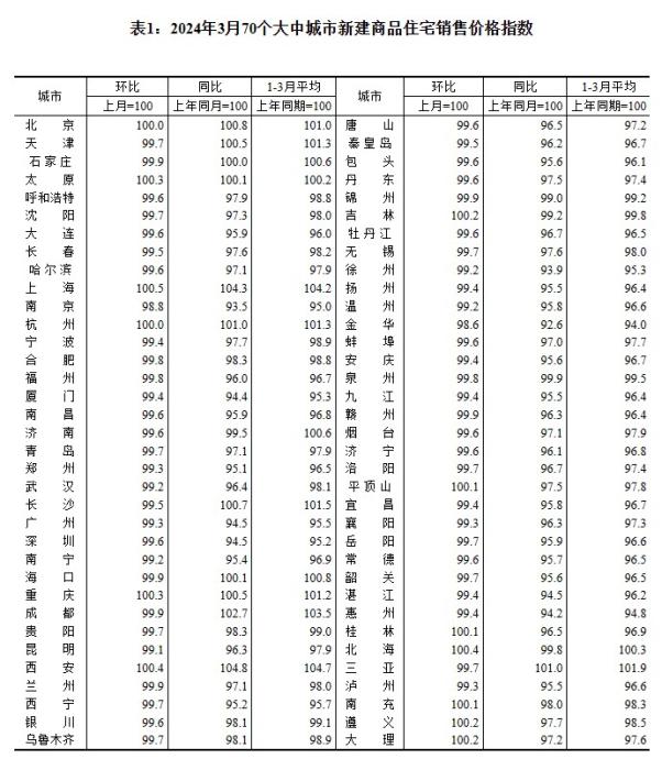 2024年3月70個大中城市新建商品住宅銷售價格指數。 截圖自國家統計局官網