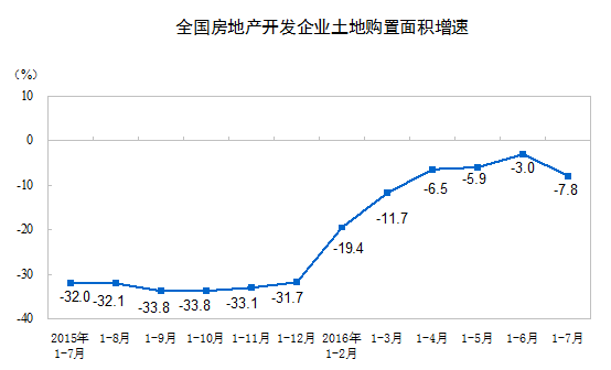 1-7月份,房地產(chǎn)開發(fā)企業(yè)土地購置面積11167萬平方米,同比下降7.8%,降幅比1-6月份擴大4.8個百分點;土地成交價款3848億元,增長7.1%,增速回落3.1個百分點。