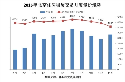 按照慣例,10月之后北京租賃市場進入傳統(tǒng)淡季,剛剛過去的11月,北京月租金均價創(chuàng)年內(nèi)新低。據(jù)偉業(yè)我愛我家集團市場研究院統(tǒng)計,2016年11月,北京區(qū)域通過我愛我家達成的住宅租賃交易量環(huán)比10月同期上漲14.8%,但月租金均價為4107元/平米,環(huán)比10月下跌6.9%。