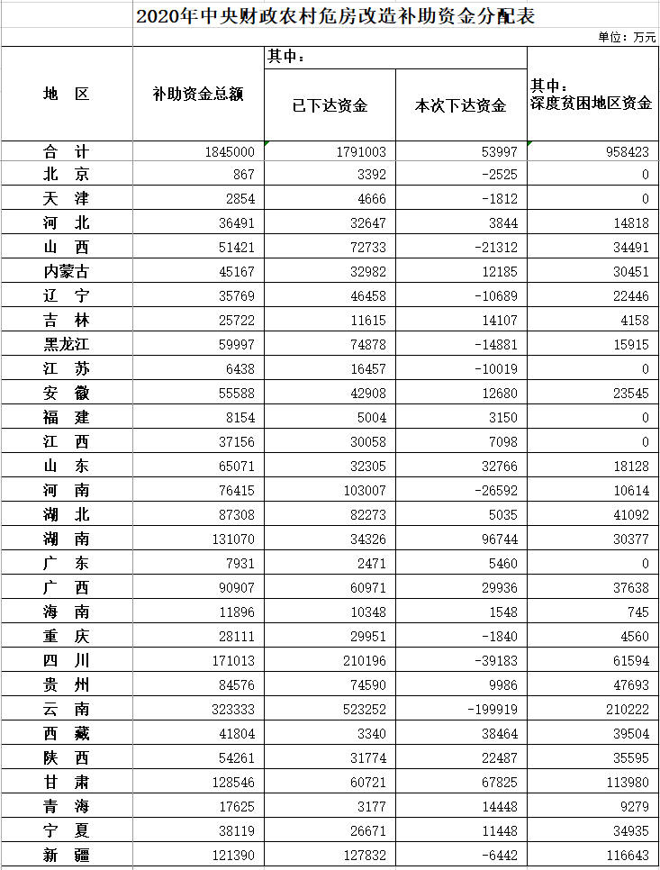 人民網(wǎng)北京6月18日電(記者孫紅麗) 近日,財(cái)政部、住房城鄉(xiāng)建設(shè)部聯(lián)合發(fā)布《關(guān)于下達(dá)2020年中央財(cái)政農(nóng)村危房改造補(bǔ)助資金預(yù)算的通知》。《通知》顯示,29個(gè)省份補(bǔ)助資金總額為184.5億元。