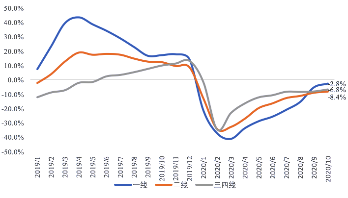 2019年至今66座大中城市中各線級城市合計月度成交套數(shù)累計同比(%) 數(shù)據(jù)來源:WIND,10月全部數(shù)據(jù)為全月預(yù)測值