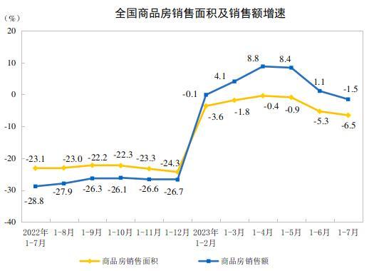 1—7月份,商品房銷售面積66563萬平方米,同比下降6.5%,其中住宅銷售面積下降4.3%。商品房銷售額70450億元,下降1.5%,其中住宅銷售額增長0.7%。