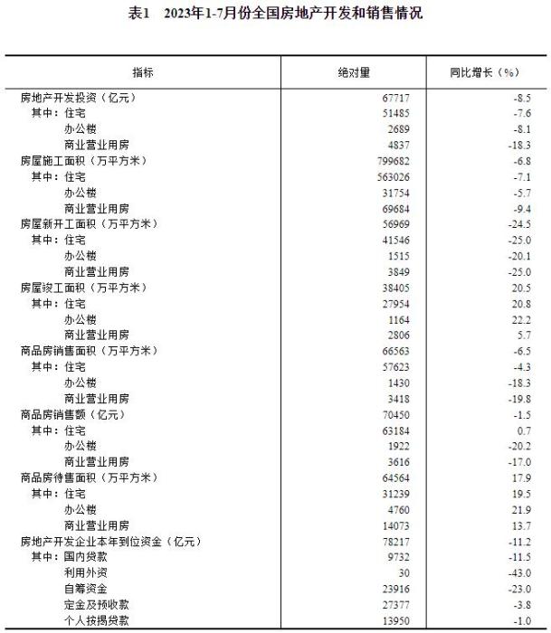 中新網(wǎng)8月15日電 國家統(tǒng)計局網(wǎng)站15日公布2023年1—7月份全國房地產(chǎn)市場基本情況。1—7月份,全國房地產(chǎn)開發(fā)投資67717億元,同比下降8.5%;商品房銷售額70450億元,下降1.5%。