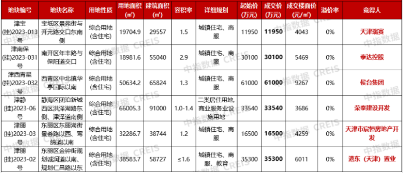 此外,津靜(掛)2023-06號地塊位于靜海區(qū)團泊新城西區(qū)洪澤湖路東側(cè)、津澤道南側(cè),由天津市榮泰建設(shè)開發(fā)有限公司底價3.354億摘得,樓面價3686元/㎡。津南保(掛)2023-031號地塊位于南開區(qū)年豐路與保陽道交口,為南開天拖城市更新地塊,由泰達控股起始價3.01億元摘得,樓面價5469元/㎡。津?qū)?掛)2023-013號地塊位于寶坻區(qū)幸福路與景苑街交口西南角,由天津瑞賽起始價1.195億元摘得,樓面價4043元/㎡。