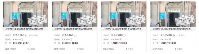 圖片來源:阿里資產(chǎn)官網(wǎng)。 只賣2%的房產(chǎn) 據(jù)阿里資產(chǎn)·司法平臺(tái)顯示的信息,北京市門頭溝區(qū)東老店5號(hào)樓5層503號(hào)(2%份額)在幾天前結(jié)束了拍賣,最終以26166.6元的價(jià)格被拍下。 從圖片看,這一房產(chǎn)可謂是典型的“老破小”。拍賣信息顯示其建筑面積為59.11平方米,規(guī)劃用途住宅。按照2%的份額計(jì)算是1.1822平方米,若以面積體現(xiàn)比例,大概就是客廳茶幾大小。 拍賣信息還顯示,這套房產(chǎn)2%的份額已經(jīng)被多次拍賣。例如在2023年10月17日的一拍中,有買家以32708.24元的價(jià)格將其拍下;但隨后于2023年10月30日確定交易未履行。 19日,中新財(cái)經(jīng)記者多次致電資產(chǎn)處置單位北京市平谷區(qū)人民法院,均未能接通。 其相關(guān)工作人員此前回應(yīng)媒體稱:2%的份額沒有對(duì)房子的絕對(duì)使用權(quán),但在房本上會(huì)有所體現(xiàn)。如果搬不進(jìn)去,可以起訴擁有98%份額的人,要求把那部分權(quán)益以現(xiàn)金的形式補(bǔ)上,但這得另訴。