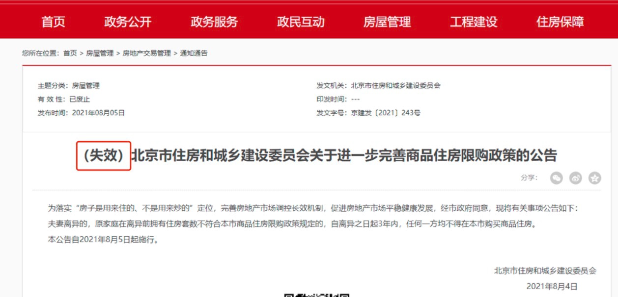 2021年8月4日,北京市住建委發(fā)文規(guī)定,夫妻離異的,原家庭在離異前擁有住房套數(shù)不符合本市商品住房限購(gòu)政策規(guī)定的,自離異之日起3年內(nèi),任何一方均不得在本市購(gòu)買(mǎi)商品住房。