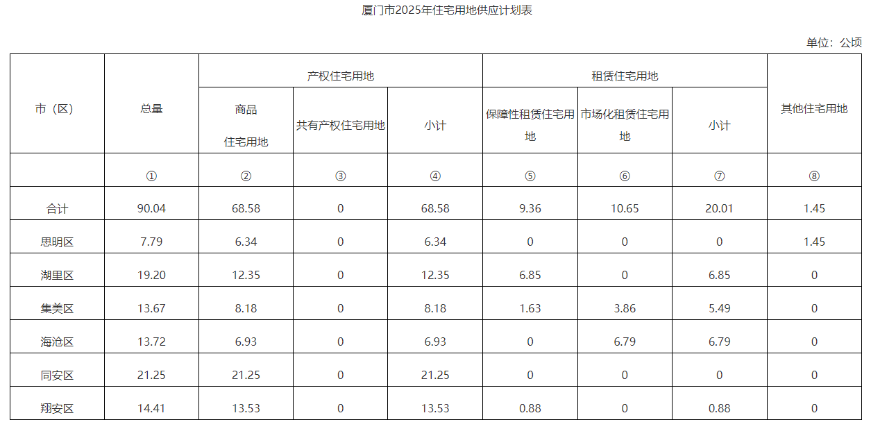 從住宅用地總量和結(jié)構(gòu)來看,2025年廈門市住宅用地計(jì)劃供應(yīng)90公頃,其中產(chǎn)權(quán)住宅用地69公頃(商品住宅用地69公頃,共有產(chǎn)權(quán)住宅用地0公頃),租賃住宅用地20公頃(保障性租賃住宅用地9公頃,市場(chǎng)化租賃住宅用地11公頃),其他住宅用地(拆遷安置房)1公頃。