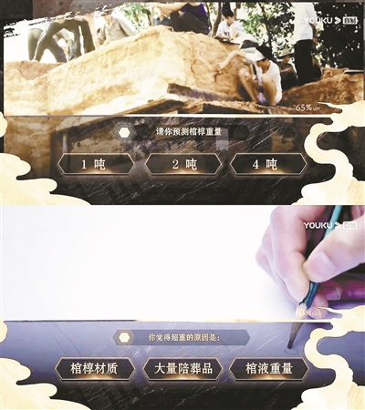 最近5集紀(jì)錄片《古墓派·互動(dòng)季》完結(jié),這部被稱為“中國第一部互動(dòng)紀(jì)錄片”的作品,把探案融入到觀看的過程中。影像本身除了傳統(tǒng)中我們設(shè)想的“做選擇題”,還包括滑動(dòng)按鈕打開棺蓋、點(diǎn)擊屏幕扇動(dòng)扇子、提取丹砂中的水銀;或長按屏幕,為古尸拍攝X光片、拼接關(guān)鍵證據(jù)……這些需要“動(dòng)手”的操作,把觀眾帶入一個(gè)與傳統(tǒng)紀(jì)錄片不同的場景中。觀眾在片中的互動(dòng)表現(xiàn)在結(jié)尾處會(huì)得到一個(gè)評(píng)級(jí),你是“博古通今”還是“牛刀小試”,原有私人的觀看體驗(yàn)被數(shù)值量化。