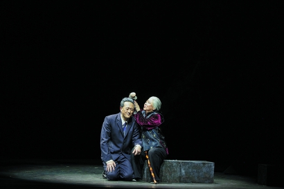 這一幕開場時,先是潮汕英歌舞——潮汕民間流傳的懲惡揚善、吉祥平安的舞蹈。接著,一頭白發(fā)的黃旭華偕妻登場。臺口,另一位拄著拐杖、顫顫巍巍的老太太向他凝望。這就是黃旭華的老母親,她言語不多,不時以拐杖重擊地板,表達澎湃的心情。黃旭華拿出當(dāng)年母親留給他的銀梳子,想跪下來給母親梳頭。誰料,母親激動地說:“我就知道兒子沒有忘記我!”她反而說,要替兒子梳頭。因為她明白:“對祖國的忠,就是對父母最大的孝?!?/span>