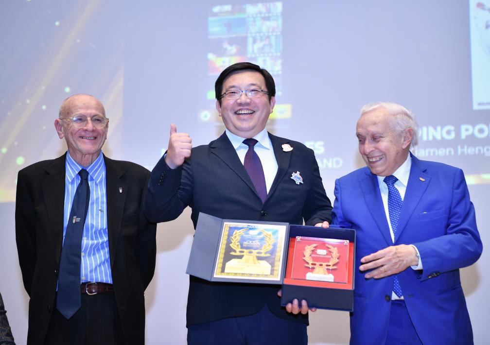 11月11日,影片《我們的冬奧》監(jiān)制、導(dǎo)演王諍(中)在頒獎(jiǎng)典禮上領(lǐng)取金花環(huán)獎(jiǎng)。新華社記者 任鵬飛 攝