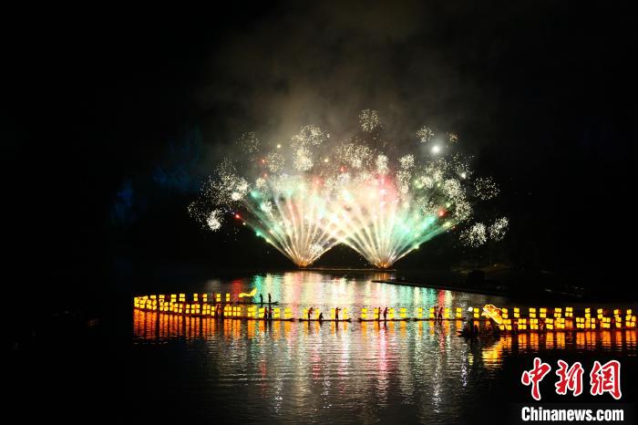 《印象·劉三姐》歡慶公演20周年。 周利朔 攝 慶典演出現(xiàn)場人頭攢動(dòng),開場無人機(jī)表演在半空組合出紀(jì)念“印象劉三姐20年”的圖案,舞臺(tái)上擊鼓而舞的表演者渲染歡樂氛圍。以絢爛煙火為背景,漁翁表演者在江面組成蜿蜒長龍,引得游客們紛紛贊嘆拍照。慶典演出環(huán)節(jié),桂林旅游學(xué)院和《印象·劉三姐》的演員們共同表演的舞蹈《漓江·春茶》、百人合唱《侗族大歌》、實(shí)景展演《龍騰印象》等精彩節(jié)目,帶來一場視覺盛宴。 20周年慶期間,《印象·劉三姐》園區(qū)特別增設(shè)互動(dòng)體驗(yàn)項(xiàng)目和美陳裝置,旨在提升中外游客的參與感和體驗(yàn)感。在園區(qū),項(xiàng)目首次設(shè)立“打歌臺(tái)”,帶來豐富有趣的山歌互動(dòng)活動(dòng),讓游客親身體驗(yàn)山歌演唱的魅力,進(jìn)一步拉近觀眾與藝術(shù)的距離。