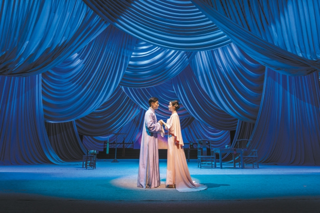 近日,北京人民藝術(shù)劇院再次排演該劇,以意象化手段賦予劇中男女主人公的愛情以詩意——不但在兩人交談時加入了許多戲曲身段,更加入了新的臺詞強(qiáng)化兩人的愛慕之情;結(jié)尾以一段雙人舞展現(xiàn)兩個自由的靈魂在虛空中的相會;不時出現(xiàn)的昆曲《牡丹亭》作為背景音樂,昭示兩人超越生死的愛戀。