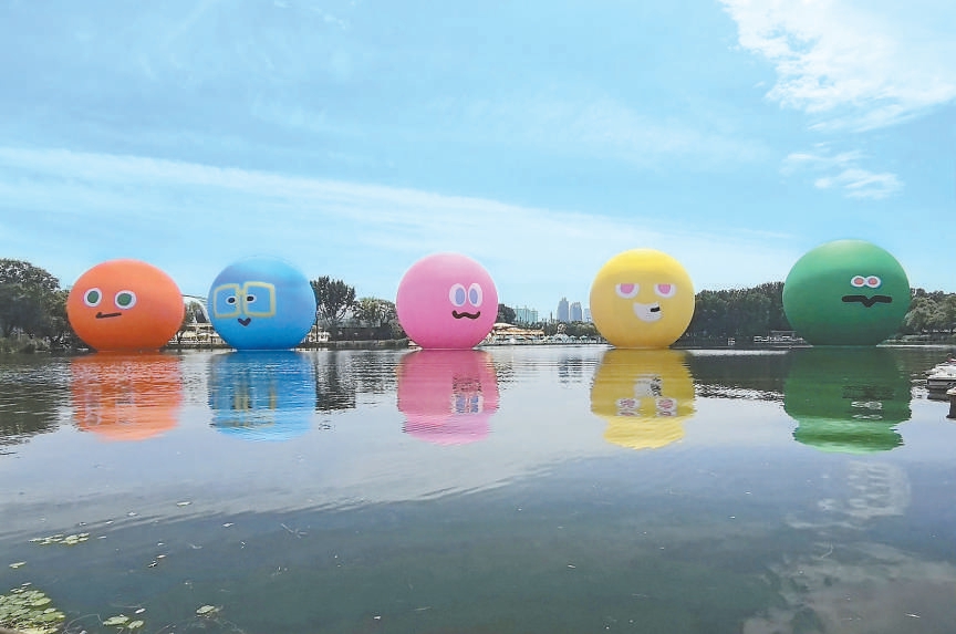 近日,朝陽(yáng)公園北碼頭附近的湖面上新添五個(gè)10米高的充氣大球,粉色、黃色、綠色等不同顏色,對(duì)應(yīng)的是樂(lè)隊(duì)組合五月天的不同成員,也與今年7月25日至8月9日,五月天在鳥巢舉辦演唱會(huì)的舞臺(tái)裝置遙相呼應(yīng)。與此同時(shí),樂(lè)隊(duì)成員的人物公仔也分別放置在居庸關(guān)長(zhǎng)城、首鋼園、鼓樓廣場(chǎng)、798·751藝術(shù)區(qū)、亮馬河畔等地標(biāo)景點(diǎn)。