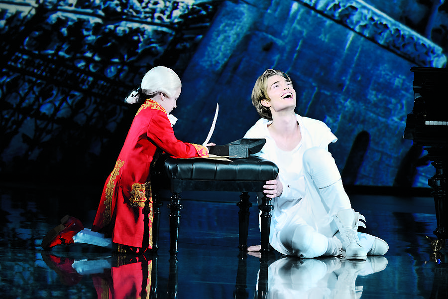 《莫扎特!》中體現(xiàn)辯證法的最妙手段并不是常見的代表正題、反題的辯論語言,而是一個(gè)幾乎從頭到尾都在臺(tái)上但從不說話的“小莫扎特”阿瑪?shù)隆?/p>