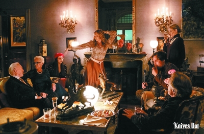 推理電影通常具有典型的“三幕結(jié)構(gòu)”——第一幕展示案件,在全景式的描述中暗藏重要細(xì)節(jié);第二幕偵探盤問嫌疑人,在抽絲剝繭中靠近唯一的事實(shí);第三幕真相大白。《利刃出鞘》的故事也有分隔明確的“三幕”,但其結(jié)構(gòu)方式卻大不相同。電影跳過了對案件本身的講述,開篇即告訴觀眾死者已逝的結(jié)果,所有對案件經(jīng)過的描寫也都僅存在于嫌疑人主觀回憶的閃回畫面中。案件如何發(fā)生不再是鋪敘的重點(diǎn),死者與嫌疑人們之間糾葛的關(guān)系、人物復(fù)雜的動機(jī)與各自的內(nèi)心秘密,被開門見山地凸顯出來。如此一來,《利刃出鞘》在一幕的篇幅內(nèi)完成了以往推理電影中至少兩幕的故事敘述。在第三幕真相大白之前,電影相當(dāng)于多出一幕,可以對第一幕的內(nèi)容進(jìn)行反轉(zhuǎn)與豐富。這種對“三幕結(jié)構(gòu)”的新奇安排,令影片的節(jié)奏速度與內(nèi)容密度大大提高。
