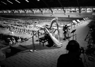 牛背梁最近陰雨連連,樂團(tuán)必須帶上雨布和雨衣;華山陡峭,得用纜車運(yùn)送樂器,山頂大風(fēng)吹得樂譜亂飛,平時(shí)在戶外固定譜子的磁條抵擋不住,只能改成橡皮筋這種“土方法”;在秦始皇陵和其他博物館里演出,燈光必須調(diào)試到國家規(guī)定的范圍內(nèi),聲音也不能超過游客最多時(shí)的嘈雜程度,選用的樂器都是柔和的弦樂和木管……