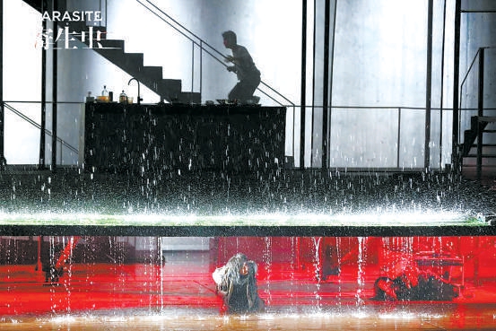 在這方如同社會切面的舞臺上,密集的戲劇沖突快速展開。前半部分情緒高漲,金家人的把戲不斷得逞,做起了漫無邊際的美夢。而隨著一場意外的大暴雨,故事急轉(zhuǎn)直下,三家人的矛盾即刻爆發(fā),奔向了格外慘烈的結(jié)局。在兩個(gè)多小時(shí)的表演中,演員們相當(dāng)賣力,飾演金家姐弟的郝蕾與馬天宇都交上了合格的答卷。在對姐姐金基婷一角的駕馭上,話劇表演經(jīng)驗(yàn)豐富的郝蕾顯然游刃有余,甚至?xí)層^眾感嘆她的演技有些大材小用。首次出演話劇的馬天宇也值得肯定。飾演金家父母的房子斌和趙紅薇堪稱全劇的靈魂,大段的臺詞、極致的情感落差對他們的體力和表演功底都提出了相當(dāng)高的要求。謝幕時(shí),觀眾格外熱烈的掌聲是給予演員的最好肯定。舞臺上,金父應(yīng)聘樸社長司機(jī)、所有人為樸家小兒子演出慶生小戲劇等片段運(yùn)用了相當(dāng)風(fēng)格化的表演方式,在滑稽而悲涼的黑色幽默中,充分展現(xiàn)了舞臺藝術(shù)區(qū)別于電影的獨(dú)特虛擬性和表現(xiàn)力。