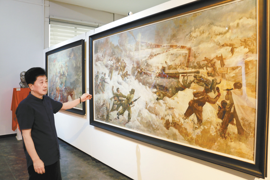 在798藝術(shù)區(qū)內(nèi),坐落著朝鮮萬壽臺創(chuàng)作社美術(shù)館,它是由朝鮮政府投資成立的唯一海外美術(shù)館,亦是中朝文化交流的重要紐帶。美術(shù)館二樓的紀(jì)念抗美援朝作品展區(qū),珍藏著蔣兆和、伍必端、戴澤等中國藝術(shù)家創(chuàng)作于上世紀(jì)五六十年代的經(jīng)典作品,不僅用藝術(shù)的語言銘刻下抗美援朝戰(zhàn)場上的感人故事,而且見證了在血與火中鑄就的中朝友誼。 ??“1951年,畫家伍必端以戰(zhàn)地記者身份到朝鮮前線采訪,創(chuàng)作多幅戰(zhàn)地速寫,這幅作品是他創(chuàng)作的油畫《中朝部隊(duì)并肩作戰(zhàn)打擊美國狼》。”朝鮮萬壽臺創(chuàng)作社美術(shù)館館長吉正太介紹,這幅畫表現(xiàn)的是上甘嶺戰(zhàn)役中激烈的戰(zhàn)斗場景,冬日的戰(zhàn)場上覆蓋著白雪,空中硝煙彌漫,中國人民志愿軍和朝鮮人民軍的戰(zhàn)士們正抗擊侵略者,有的在扔手榴彈,有的在沖鋒,還有的與侵略者近身搏斗……身處前線的伍必端用畫筆記錄下最可愛的人,展現(xiàn)出一位人民藝術(shù)家對革命事業(yè)的一腔赤誠。