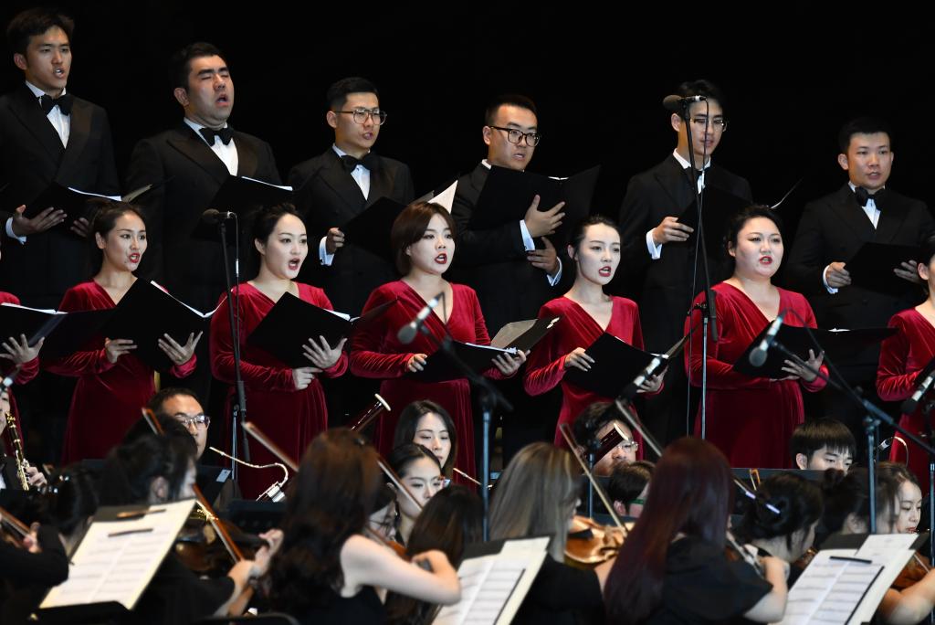 9月10日晚,西安交響樂團(tuán)合唱團(tuán)在西安大雁塔北廣場戶外公演。新華社記者 李一博 攝