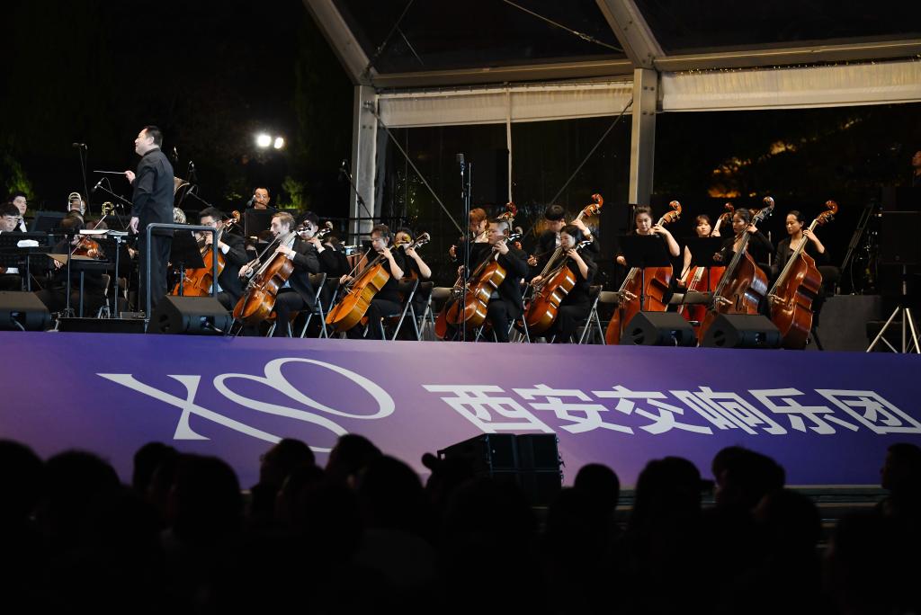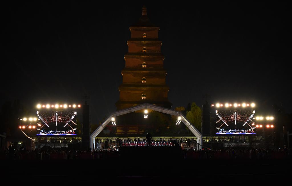 9月10日晚,西安交響樂團(tuán)在西安大雁塔北廣場戶外公演。新華社記者 李一博 攝