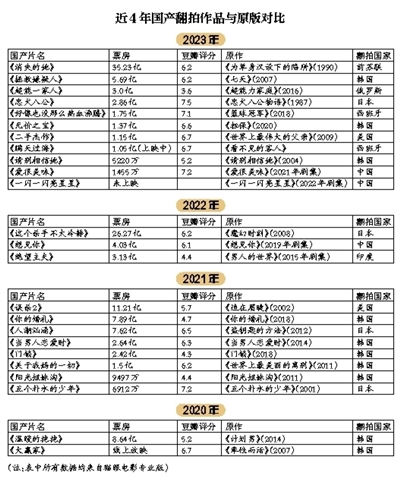 新京報(bào)整理了近4年,國(guó)產(chǎn)電影的翻拍情況,2023年有11部翻拍片上映,創(chuàng)下近5年數(shù)量之最。今年暑期檔上映的電影《消失的她》以35.23億票房,成為內(nèi)地影史翻拍片最高票房紀(jì)錄保持者。