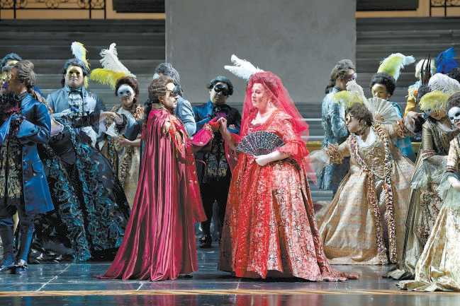 歌劇《假面舞會》取材自18世紀(jì)瑞典國王古斯塔夫三世在舞會上遇刺的真實(shí)事件,在歷史基礎(chǔ)上,作曲家威爾第、腳本作家索馬杜撰古斯塔夫三世與臣子雷納托之妻阿米莉亞的情感糾葛,讓全劇更具戲劇張力。國家大劇院版《假面舞會》的導(dǎo)演、舞美設(shè)計(jì)、服裝設(shè)計(jì)工作由烏戈·德·安納一人擔(dān)綱,由他打造的金碧輝煌的王室宮殿、魔幻荒蠻的女巫巖洞、宏大華麗的假面舞會等場景流光溢彩,跌宕起伏的故事、優(yōu)美壯闊的音樂流動其間,引人入勝。