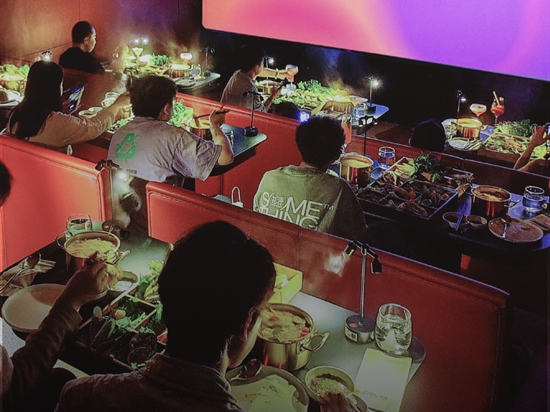 邊吃火鍋邊看電影,不只是在家里才能出現(xiàn)的場景,在三克映畫的電影院同樣能做到?!拔覀兿M麑⑷擞钞嫶蛟斐梢粋€集電影、美食、小型演出以及娛樂活動等為一體的空間?!逼放苿?chuàng)始人韓春暉表示,通常情況下,在三克映畫放映的電影與院線同步,不過在和餐飲搭配的電影選擇上,也是有講究的。他說,影院通常會選擇放映一些比較輕松、娛樂性較強的電影。