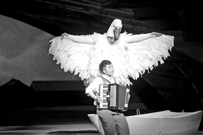 最具情趣的莫過(guò)于由北京京劇院武丑演員曹陽(yáng)陽(yáng)帶領(lǐng)一眾北戲?qū)W生演出的大鵝,身披潔白羽毛憨態(tài)可掬。這也是曹陽(yáng)陽(yáng)從藝以來(lái)第一次在舞臺(tái)上以動(dòng)物的形態(tài)進(jìn)行表演。這個(gè)與主角林大林互動(dòng)最多的角色,既要化身林大林渴望的父愛(ài),又是他孤單時(shí)的玩伴。在模仿大鵝走路的過(guò)程中,曹陽(yáng)陽(yáng)便用上了京劇武丑的技巧。其中一場(chǎng)水中救人的段落,他甚至還要從兩米多高的橋上展開翅膀飛身下去,對(duì)京劇下高、空翻技巧有了全新的展示。