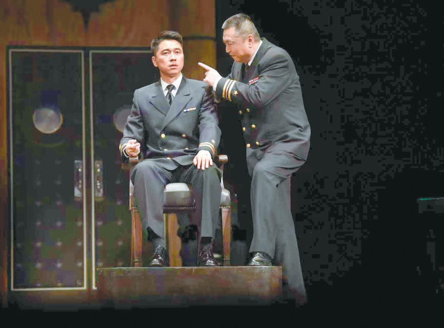 于觀眾而言,戲骨飆戲是《嘩變》格外精彩的看點,無論是制造了“草莓事件”“黃色燃料事件”“電咖啡壺事件”等一系列“鬧劇”的艦長魁格、以“詭計”掌控全場節(jié)奏的律師格林渥,還是圖窮匕見、老謀深算的基弗,抑或每一個各懷目的、性格鮮明的角色,他們之間起伏有致的銜接是對演員表演功底的極大考驗。飾演魁格的馮遠征把《嘩變》總結(jié)為一場“坐著把戲演好”的挑戰(zhàn),全劇除了格林渥與檢察官可以走動,其他所有人幾乎坐著演完全程,如何把臺詞說得詳細、說得抓人,同時靠說就把角色塑造到位,是演員需要日日精進的功課,也是觀眾愿意一再為之奔赴而來的重要理由。