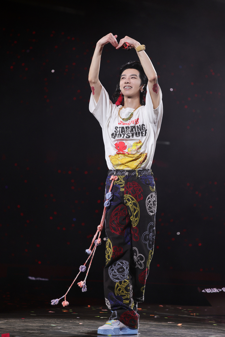 華晨宇在舞臺(tái)上說,“我的愿望是希望所有的火星人能在現(xiàn)在、還有未來(lái)可以一直都幸福?!彼e起了精心準(zhǔn)備的飯撒牌,繞場(chǎng)足足6分鐘,與四面臺(tái)的所有歌迷互動(dòng),飯撒牌上寫著,“火星人,感到幸福就比心”“愛有多深刻”。