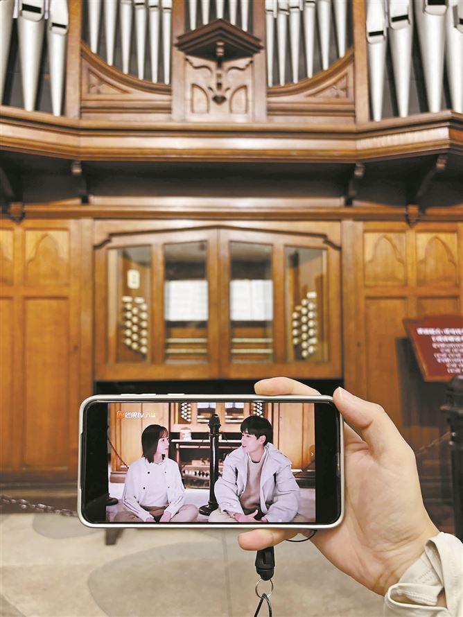 來鼓浪嶼打卡的游客將劇照和現(xiàn)場(chǎng)對(duì)比,拍照留念。
