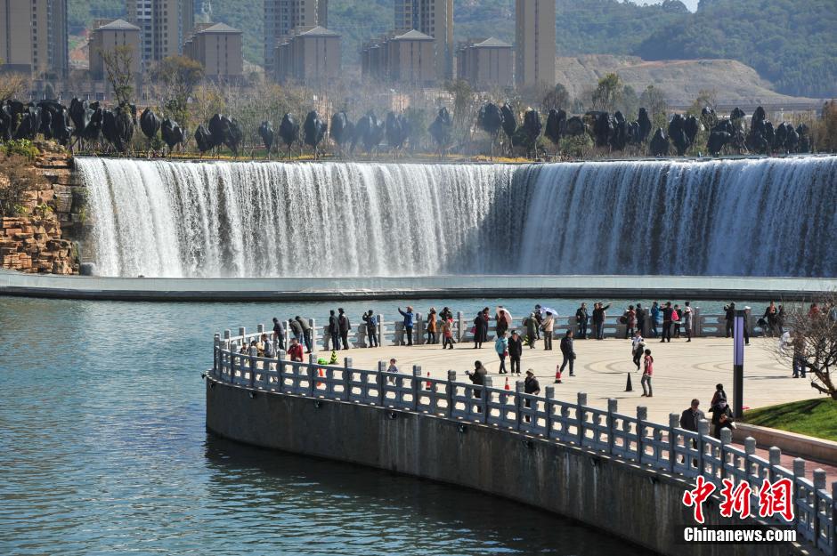 1月5日,游客在昆明瀑布公園內(nèi)游覽拍照。據(jù)了解,昆明瀑布公園1月1日開始對民眾開放,公園的瀑布利用牛欄江引水入滇工程而形成人工瀑布及湖泊,其利用約12.5米的地勢高差,建設(shè)成寬幅約400米的人工瀑布,是中國最大人工瀑布。 中新社記者 任東 攝