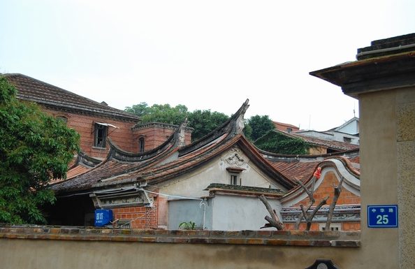 在大量的華僑洋樓建設中,體現(xiàn)出一些新風尚:一方面,立面上采用紅磚墻與少量白色線條對比的手法蔚然成風,延續(xù)了閩南紅磚厝紅磚白石的裝飾傳統(tǒng);另一方面,以裝飾藝術風格為代表的裝飾元素逐漸流行,并融合常見的傳統(tǒng)裝飾題材及西方古典裝飾元素。