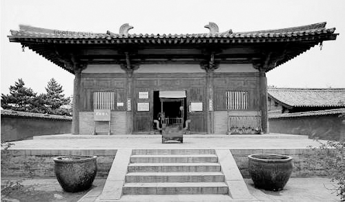 南禪寺位于山西五臺縣城西南22公里李家莊西側(cè)。坐北向南,有山門、龍王殿、菩薩殿和大佛殿等主要建筑,圍成一個(gè)四合院形式。創(chuàng)建年代不詳,大殿平梁下保存有墨書題記,足證重建于唐建中三年(782)。晚唐時(shí)武宗“會昌滅法”幸免毀壞,是我國現(xiàn)存最古的唐代木構(gòu)建筑。大殿面寬進(jìn)深各三間,單檐歇山式屋頂,殿前有寬敞的月臺,柱上安有雄健的斗拱,承托屋檐,殿內(nèi)無柱,四椽桴通達(dá)前后檐柱之外,梁架結(jié)構(gòu)簡練,屋頂舉折平緩。說明我國唐代建筑技術(shù)已有很高水平,而且已普及到偏僻山村。