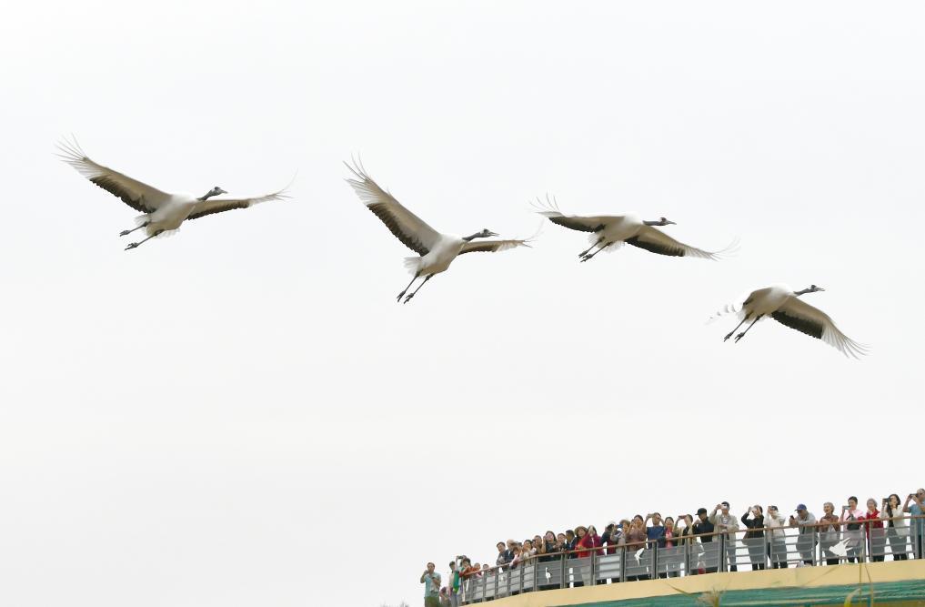 10月12日,一群丹頂鶴在東營黃河三角洲濕地飛翔。新華社記者徐速繪 攝